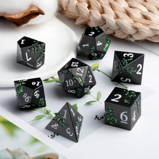 Adorned with exquisite floral engravings, these dice sets carry the essence of a blooming garden to your tabletop. The intricate details and the luster of metal come together to create a luxurious feel that stands out in any dice collection.